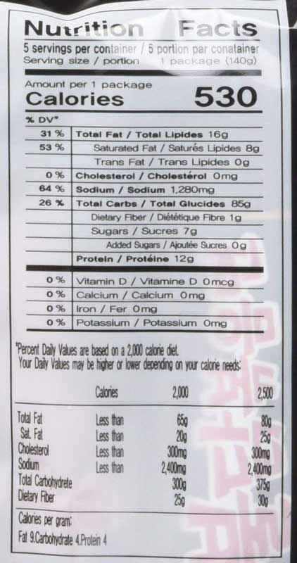 Συστατικά : Νούντλς(76.7%): wheat flour (52%), tapioca starch (12%), palm oil (11%), wheat gluten, salt, soybean oil, water, E501, E500, E339, E452, E330, E412, E322, E101.